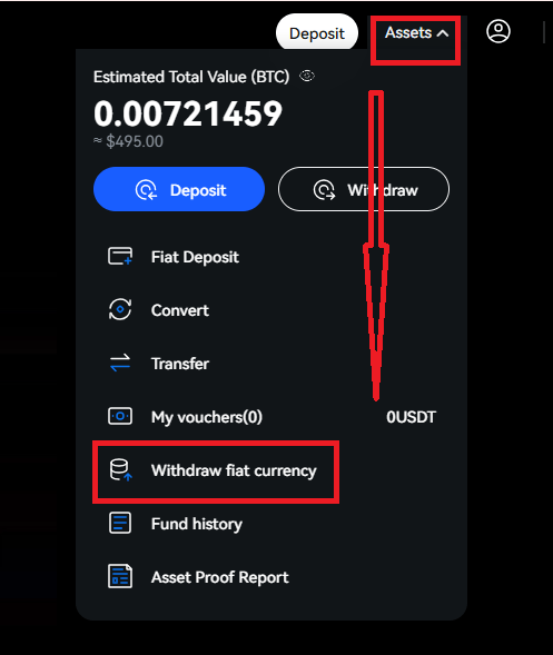 - On the BTCC website, navigate to the ‘Assets Page‘ and click on ‘Withdraw Fiat Currency.’