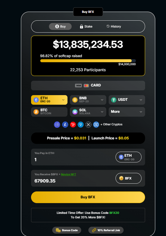 The current presale price is $0.031, with a confirmed launch price of $0.05. The presale has already proven its strength, raising over $13.8 million worth of $BFX tokens so far—representing 98.82% of its soft cap. This level of traction not only validates market interest but also signals strong community confidence.