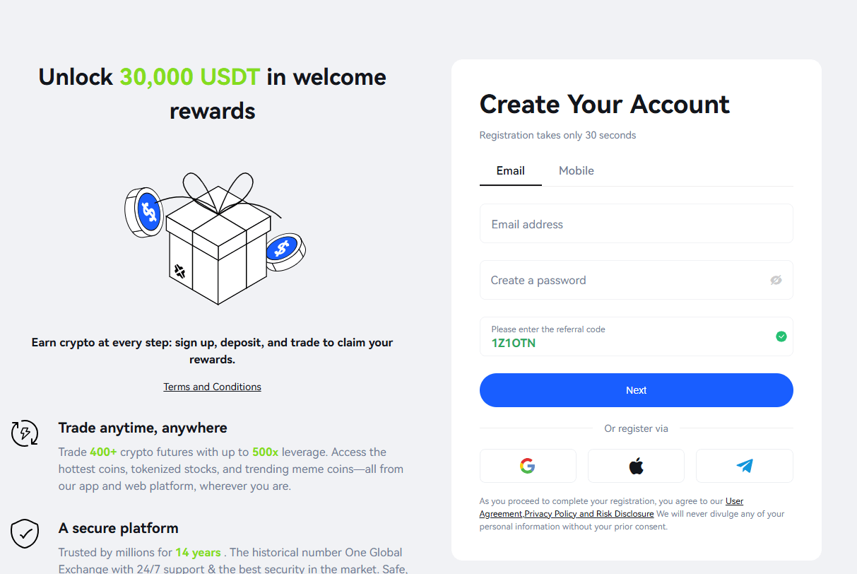 Step 1: Sign Up: Use a referral code like 1Z1OTN to sign up for the official BTCC platform. This code turns on the special 30,000 USDT reward track. You will get a $10 USDT sign-up bonus right away.