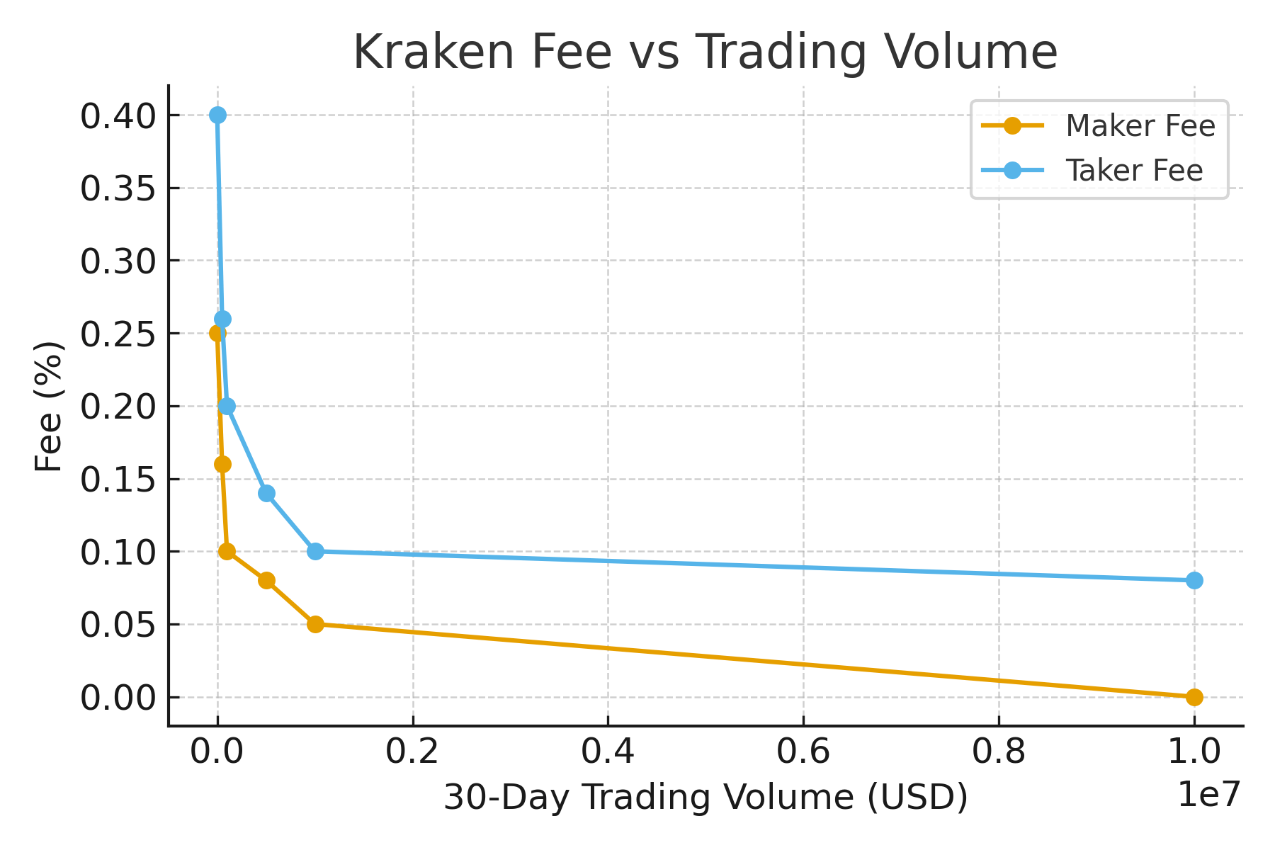 Kraken continues to be the exchange of choice for professional traders. Its tiered model rewards activity: the more you trade, the lower you pay. At volumes above $10 million per month, maker fees effectively reach 0.00%.