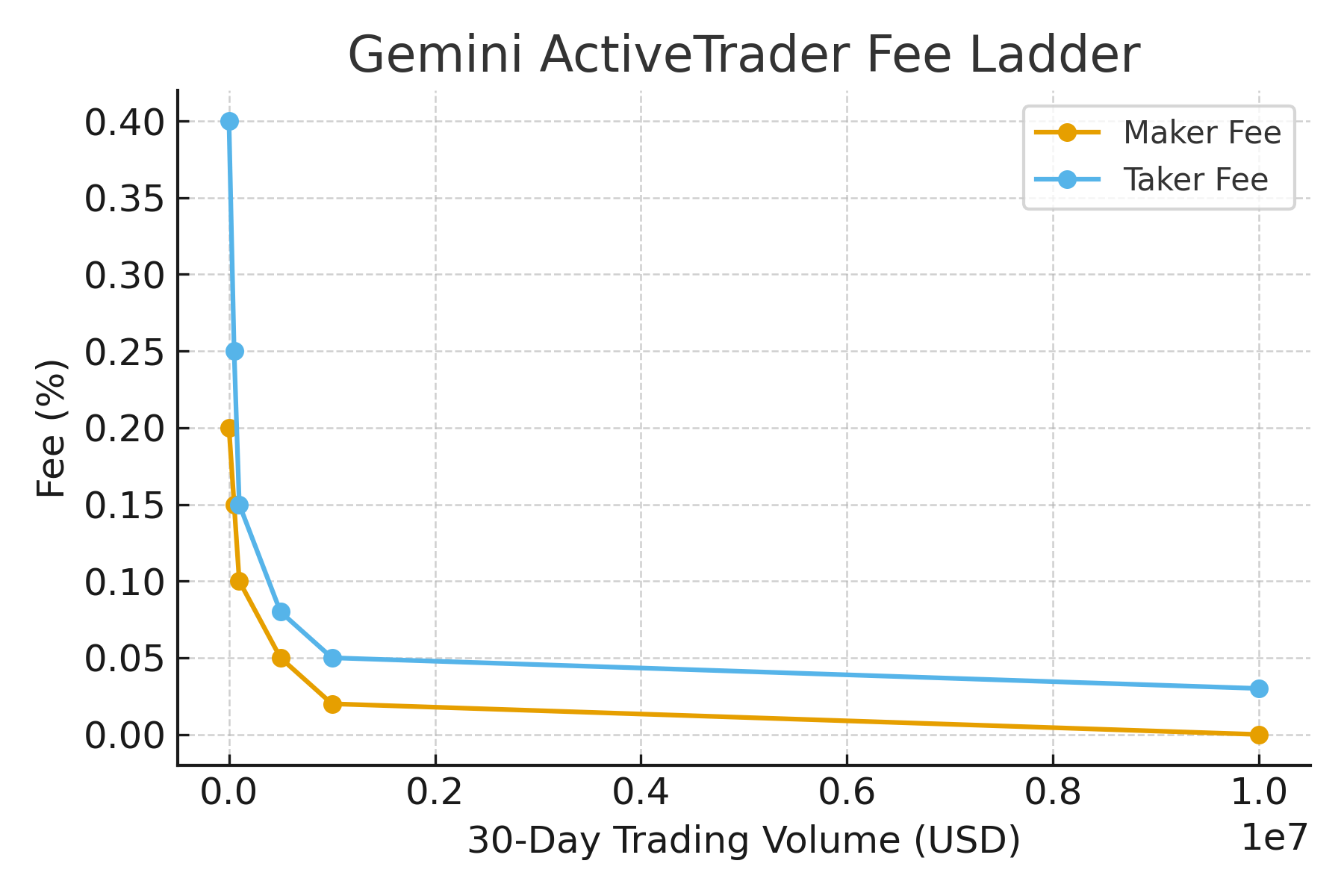 Gemini’s ActiveTrader platform has quietly built a loyal following among U.S. professionals. While Gemini’s standard web or mobile app charges higher retail fees, ActiveTrader tiers drop drastically for active accounts.