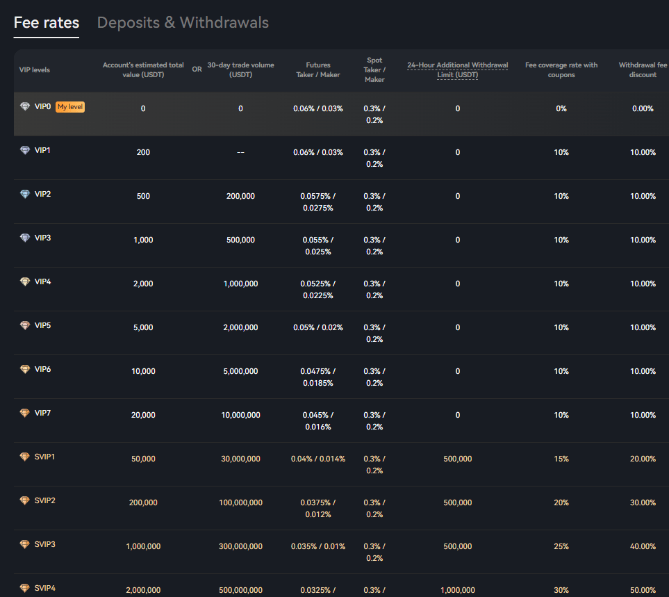 BTCC offers a highly competitive fee structure that is particularly appealing to futures traders. For spot trading, maker fees are set at 0.2%, while taker fees are 0.3%. However, it is in futures trading that the platform truly distinguishes itself, with maker fees dropping to just 0.025% and taker fees to 0.045%.