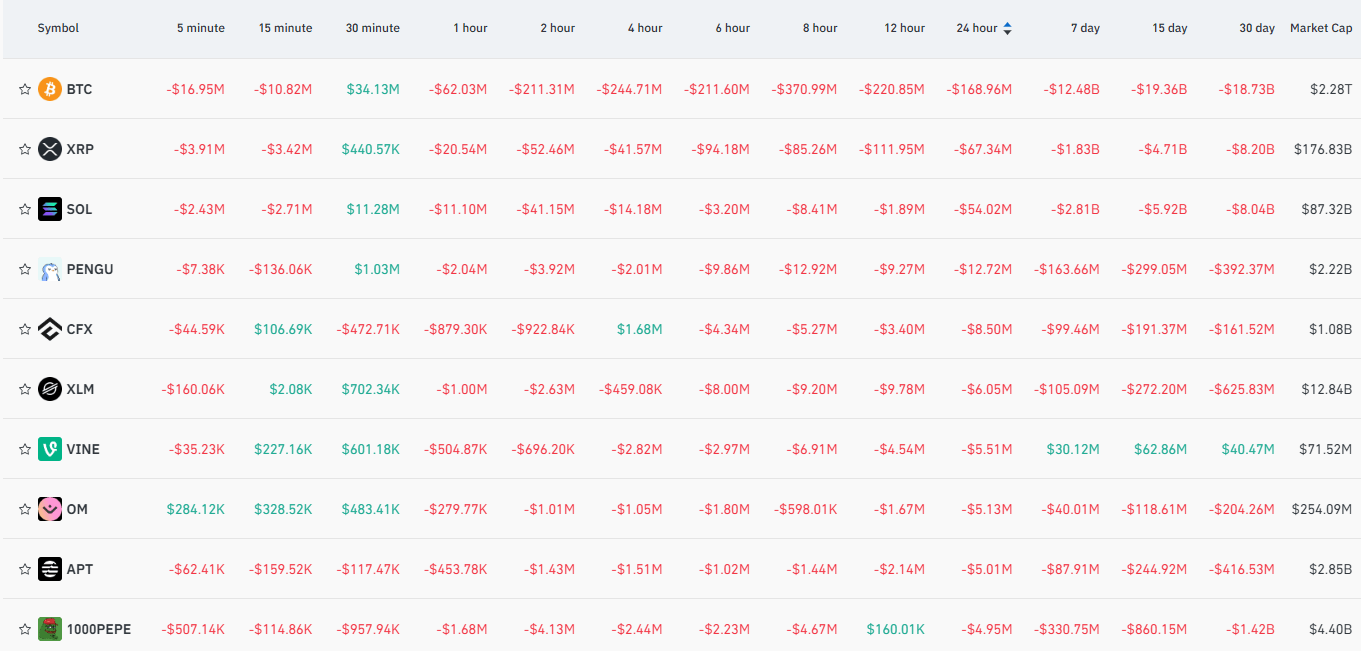 According to Coinglass (Aug 4), BTC, XRP, SOL, PENGU, and CFX saw the largest net outflows in derivatives trading over the past 24 hours, indicating potential trading opportunities.