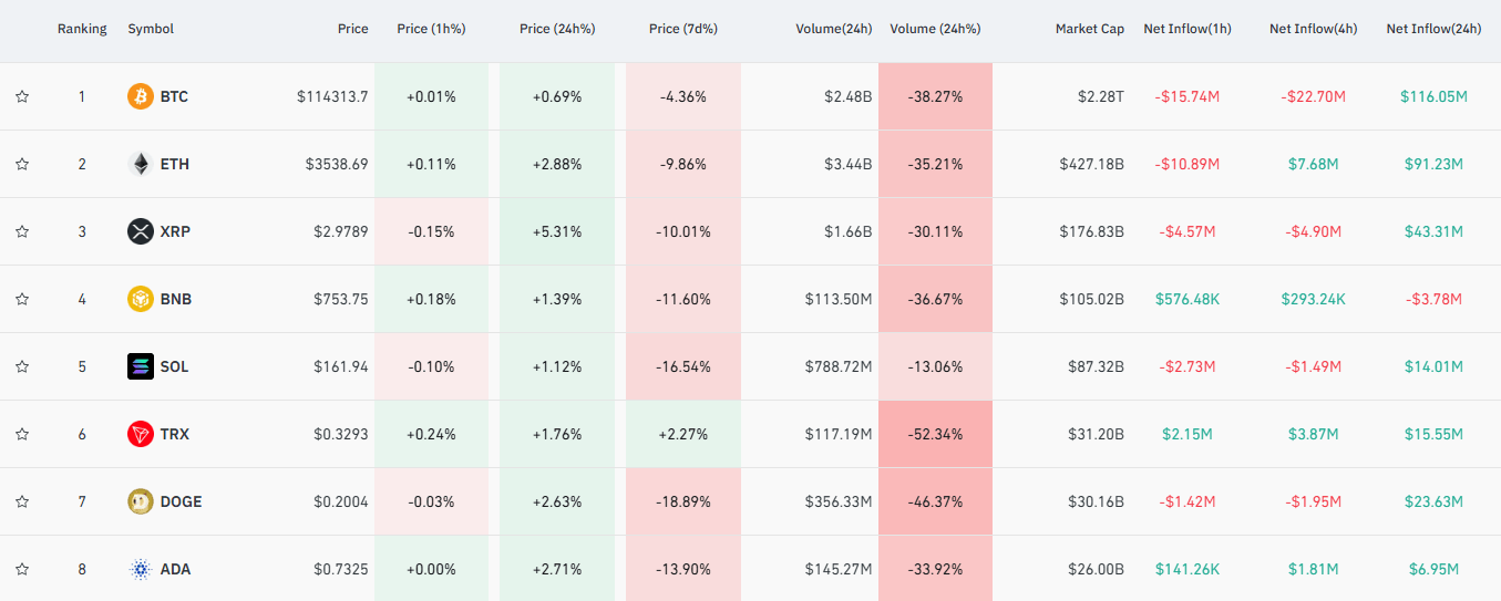 If BTC breaks and holds above $116,000, small long positions can target the $119,500 resistance zone. If it falls back below $114,000, stop-losses should be triggered to guard against further downside. With the new round of tariffs set to take effect on Aug 7, short-term market sentiment may remain unstable. Defensive positioning is advised, with trend-following entries delayed until after key data validation.
