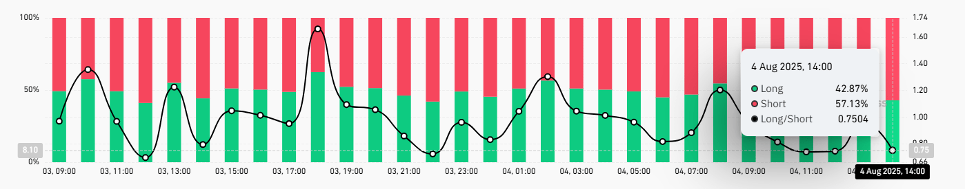 As of 14:00 HKT on Aug 4, Coinglass data shows the BTC long/short ratio at 0.7504, with longs accounting for 42.87% and shorts at 57.13%.