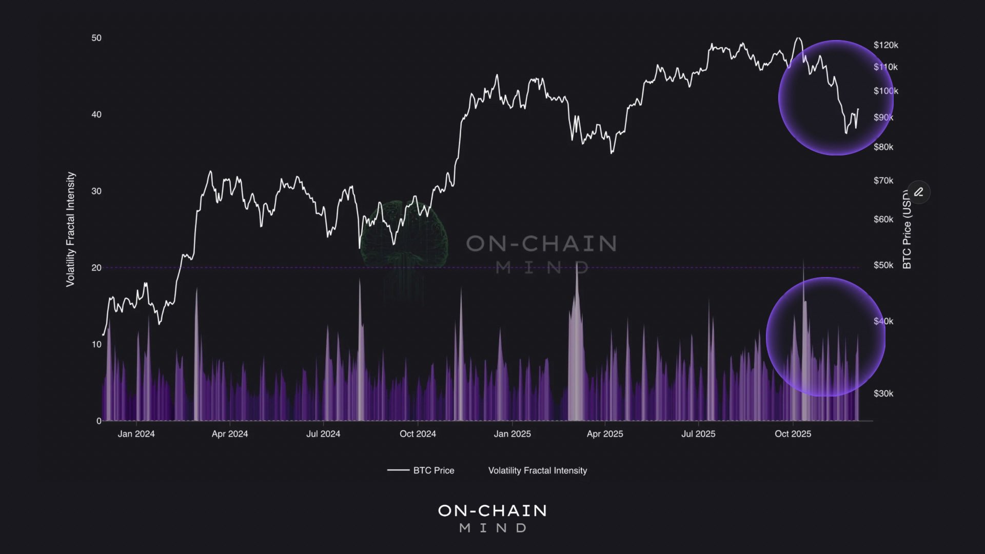 According to OnChainMind, volatility fractals currently indicate we’re not witnessing the bottom yet. This tool aligns BTC’s volatility with fractal-defined waves, suggesting deeper accumulation and rallying environments should unfold under low-volatility conditions, differing from the ongoing high-volatility phase post-October peaks.