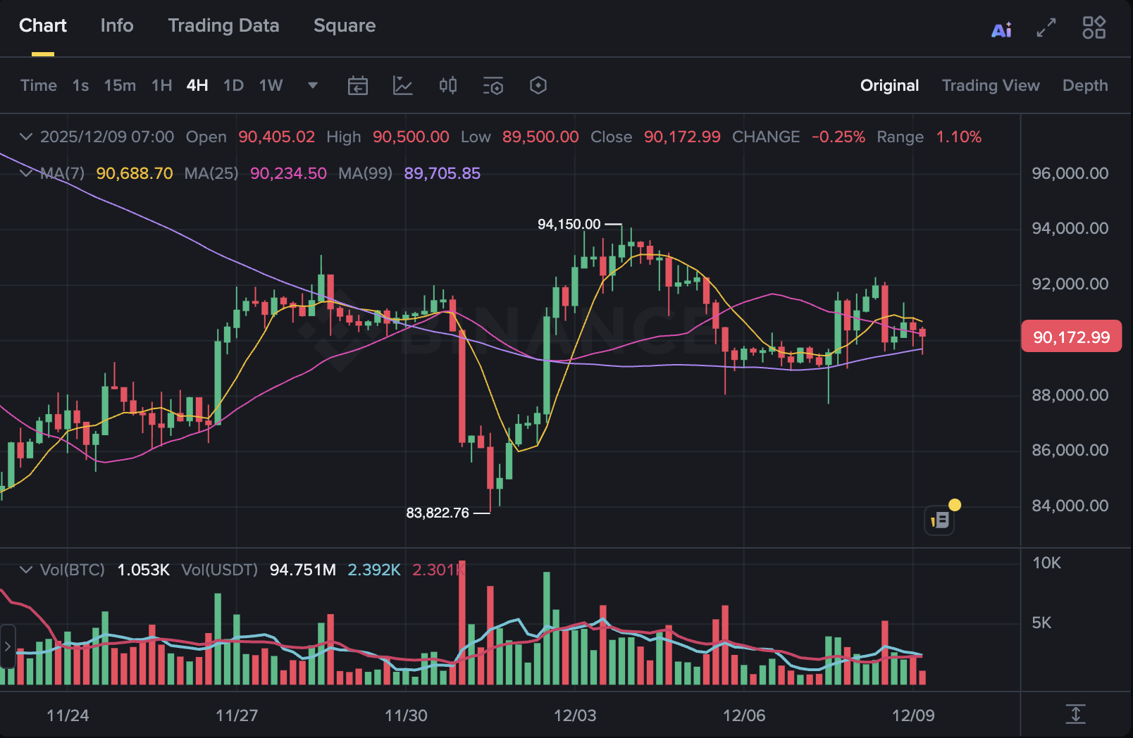 Currently, the market is witnessing a similar pattern. Bitcoin has declined by 28% from its peak of $126,000 in October, nearing the ETF cost band of $83,000. Since the beginning of December, net outflows from ETFs have been observed. The price has decreased by 1.3% in the last 24 hours, settling around $90,000. It has shown significant recovery from the trough of $84,600 tested on December 2.