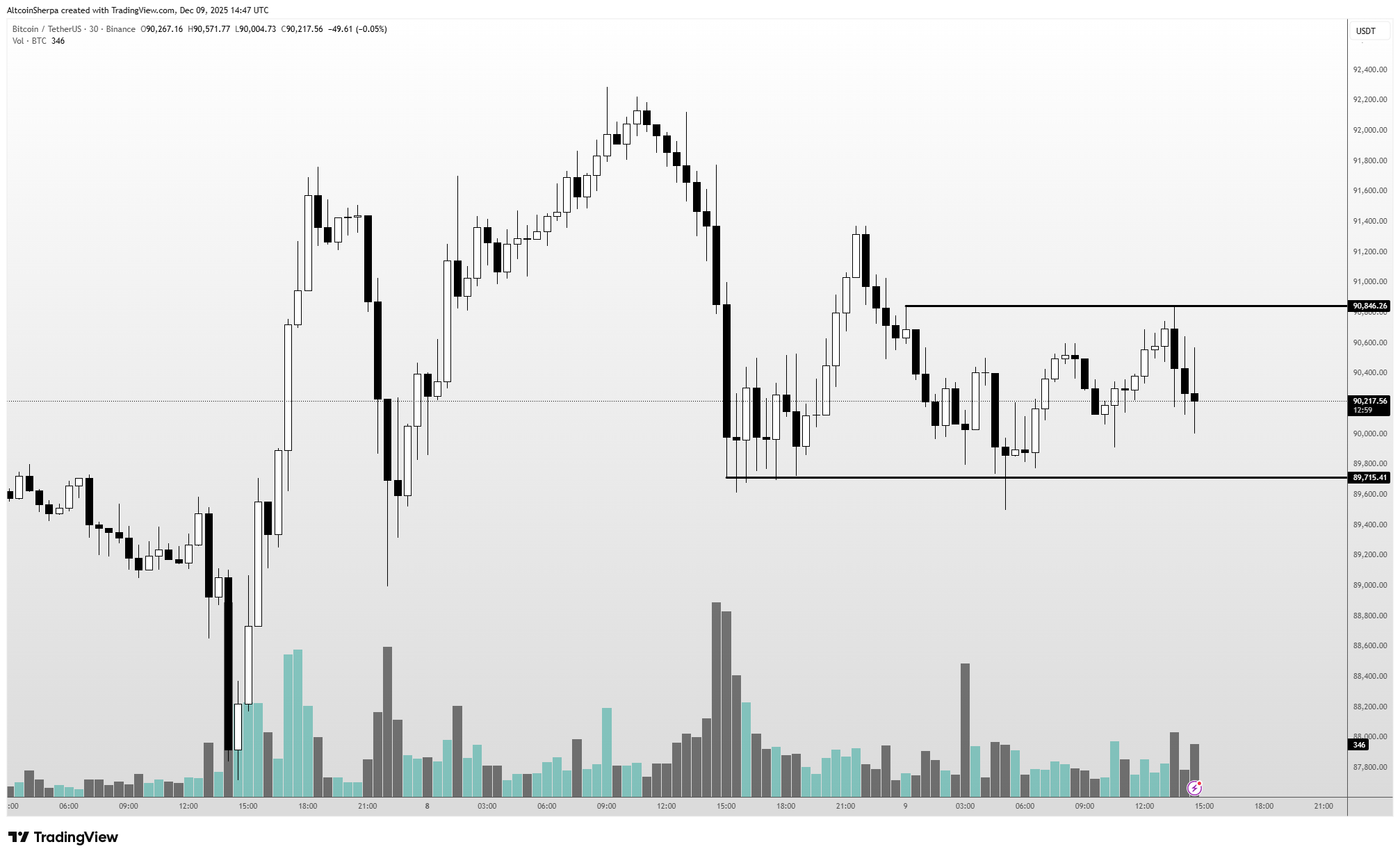 An analyst using the alias Sherpa pointed out that the highly volatile chart does not reflect a trending environment. Sherpa expects the narrow range movements to end, with the next big move predicted to reach $95,000.