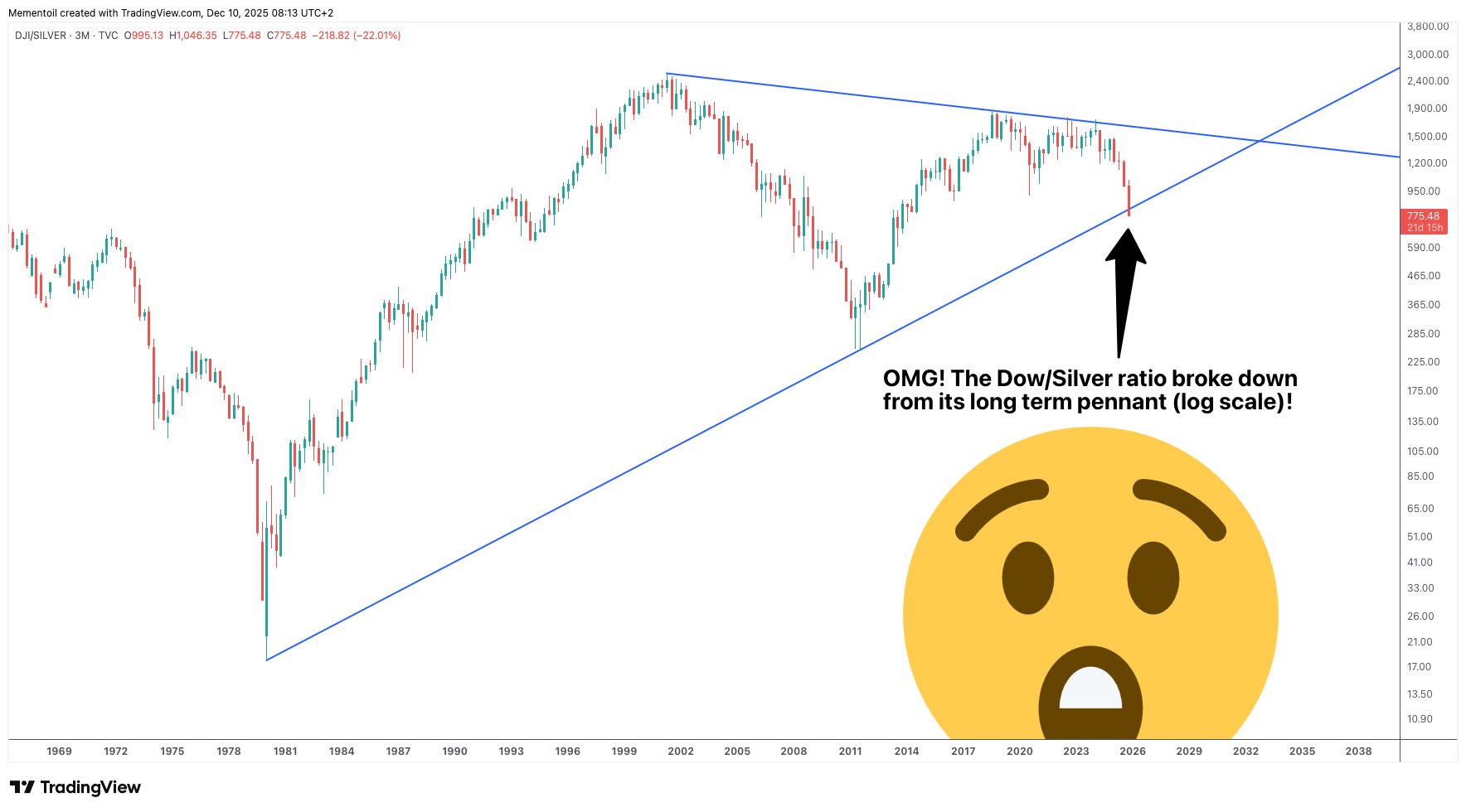 An analyst known as Oren predicts larger peaks as the Dow-Silver ratio breaks out of a 45-year-old pennant formation. He anticipates a frenzy in precious metals similar to the 1970s.