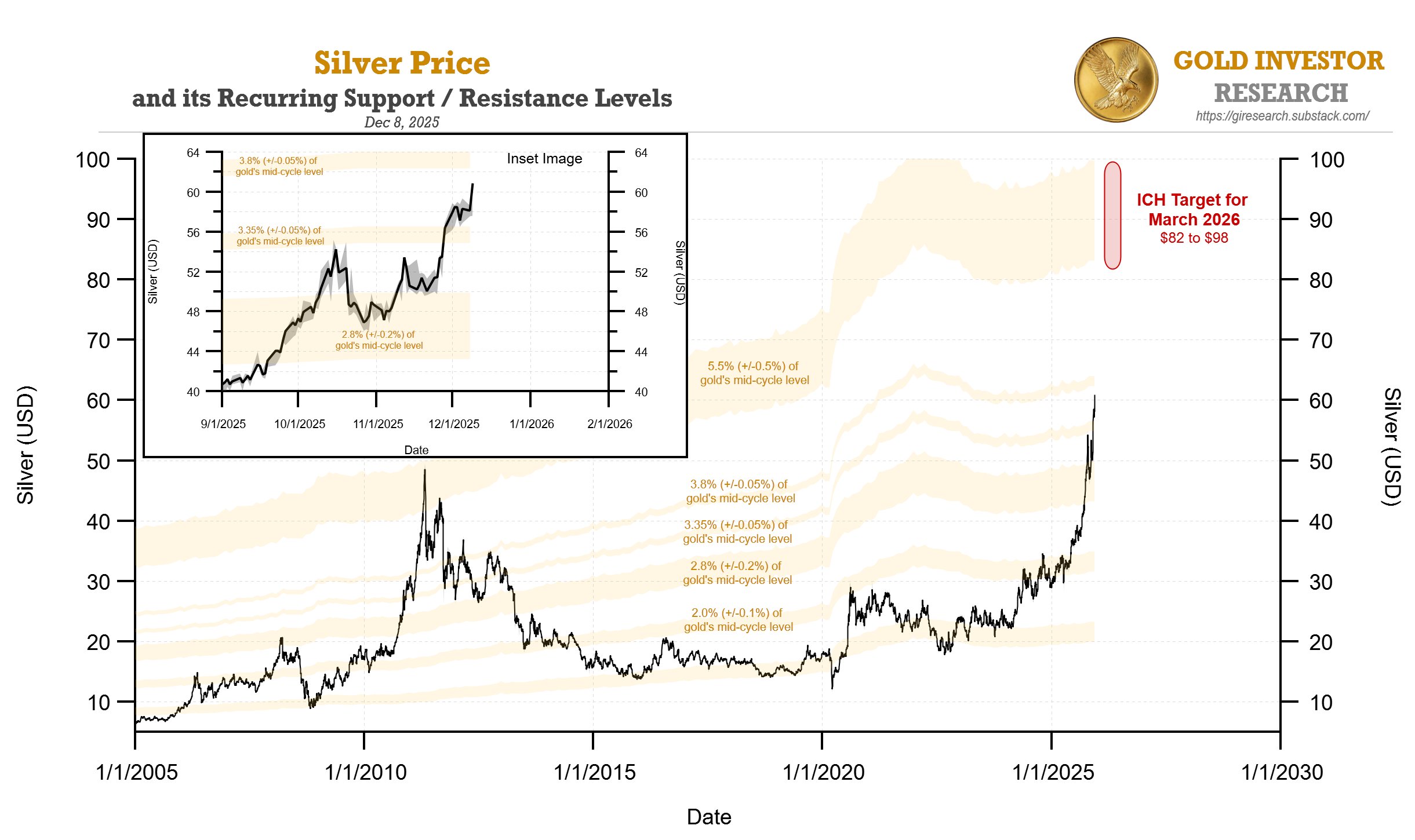 “Silver is nearing its short-term target around $63. Following this, the primary cycle peak target lies between $82 and $98, anticipated around March 2026.”