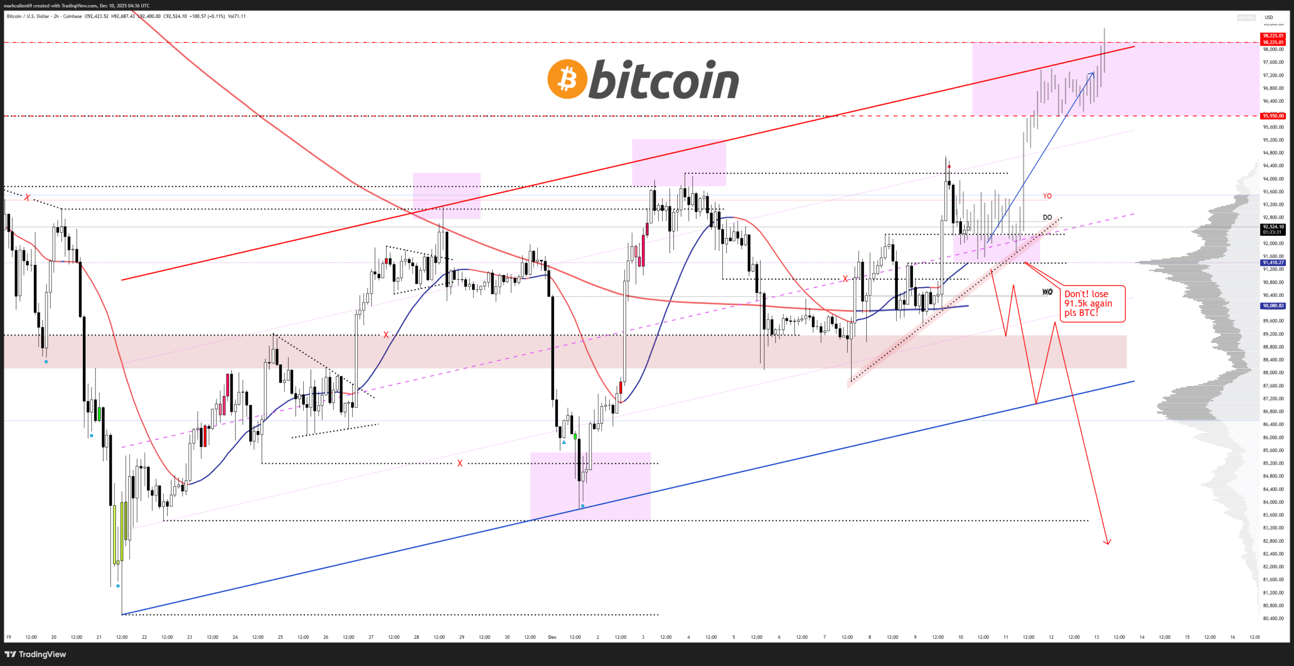 “BTC saw a nice pushback, reverting to support. The 97-98k level remains my target from weeks back. However, Bitcoin must hold at the 91.5 level, or blood may spill in the charts.”