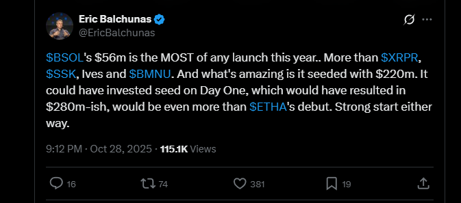 “Investors now receive not only the returns from Solana itself but also roughly 7% additional Solana per year, which functions similarly to a dividend in traditional finance,” Hougan said. The ETF’s launch involved $222 million in assets, representing over 1.1 million SOL tokens, and Bloomberg analyst Eric Balchunas noted it achieved the largest trading volume of any ETF debut in 2025.
