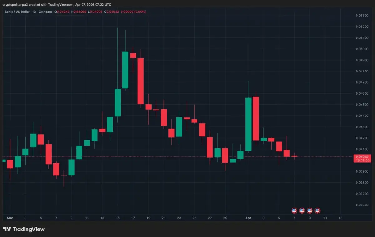 - From March 14 to late March, Sonic drifted lower from $0.0514 toward $0.040–$0.042, unable to sustain any meaningful bounces amid broad market weakness. By April 7, price pressed critical $0.040 support at $0.0396–$0.0414 — dangerously close to its all-time low of $0.0368 set on February 28.