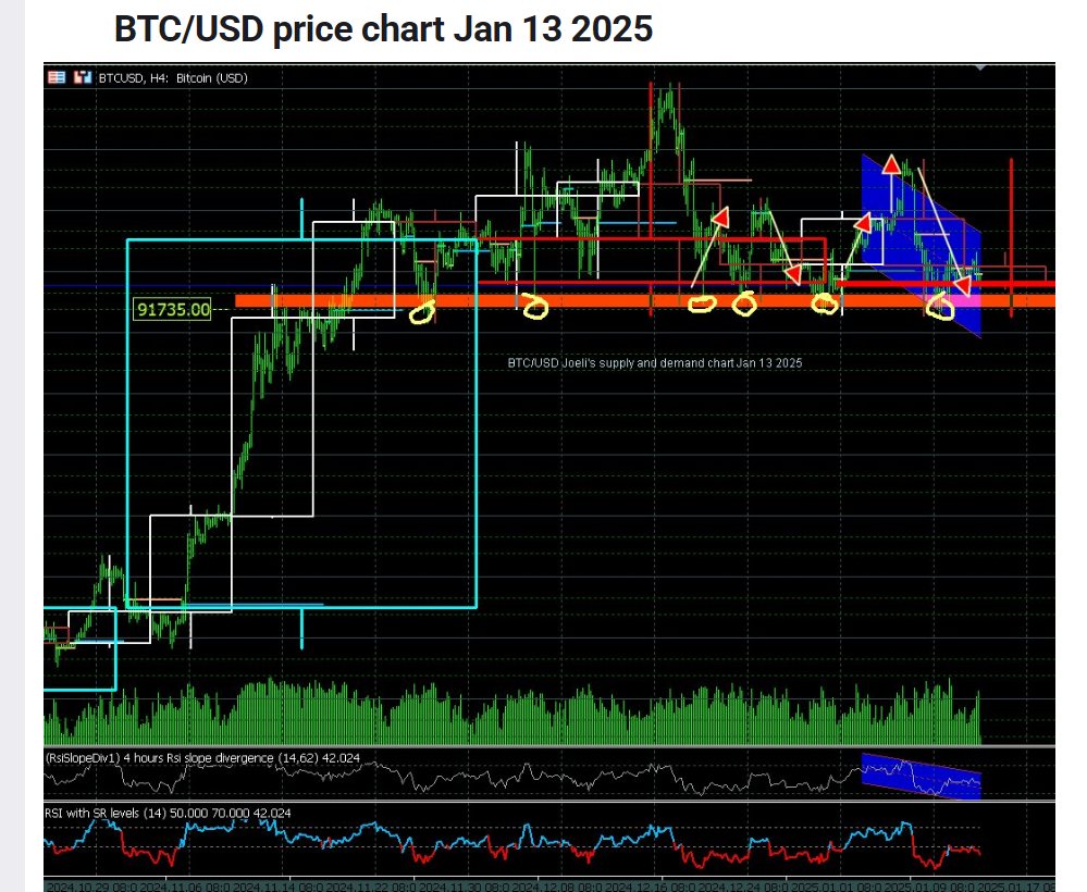 BTC/USD price chart Jan 13, 2025, analysis highlights critical support zone at 91735.