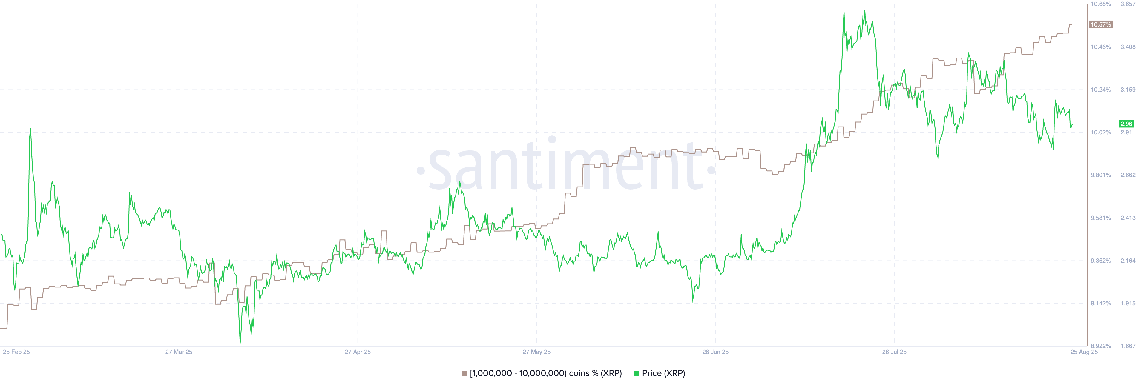 According to Santiment’s data, addresses holding between 1 million and 10 million XRP have grown to hold approximately 10.6% of the total supply from 9.8% in early July and 9.14% in early March.
