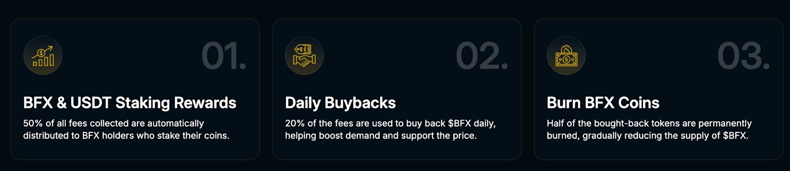 1. Utility Over Hype: While Shiba-whatever coins rely on Elon Musk tweets, $BFX delivers actual DeFi yield mechanics. No dogs. Just code.