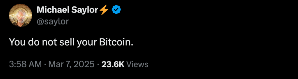 MicroStrategy co-founder Michael Saylor responded to David Sacks’ post with a brief but pointed remark: “You do not sell your Bitcoin.” His comment aligns with his long-standing advocacy for holding Bitcoin as a long-term asset rather than liquidating it.