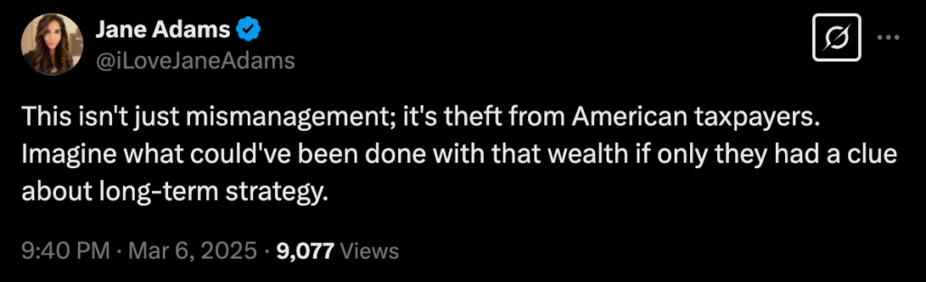 Bitcoin advocate Jane Adams stated that the government’s previous Bitcoin sales were not just an example of mismanagement but rather “theft.” “Imagine what could’ve been done with that wealth if only they had a clue about long-term strategy,” Adams wrote.