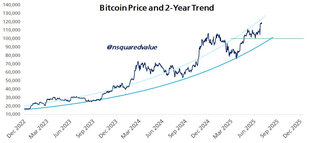 Meanwhile, if things go sideways for Bitcoin, it would be difficult to fall below the six-figure price mark, according to analyst Timothy Peterson. He shared this analysis in a July 17 post, drawing context from the 2-year price trend.