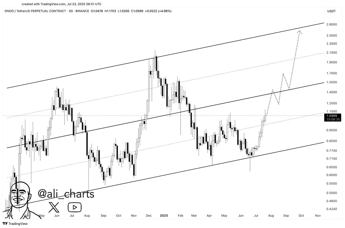 According to the chart, ONDO recently moved above the lower boundary and showed signs of upward momentum. While the recent price correction has pulled the token just below the $1 mark, the overall channel remains intact. The analyst suggests a breakout past the midline at $1.40 could trigger a stronger upward move toward the $2.80 level.