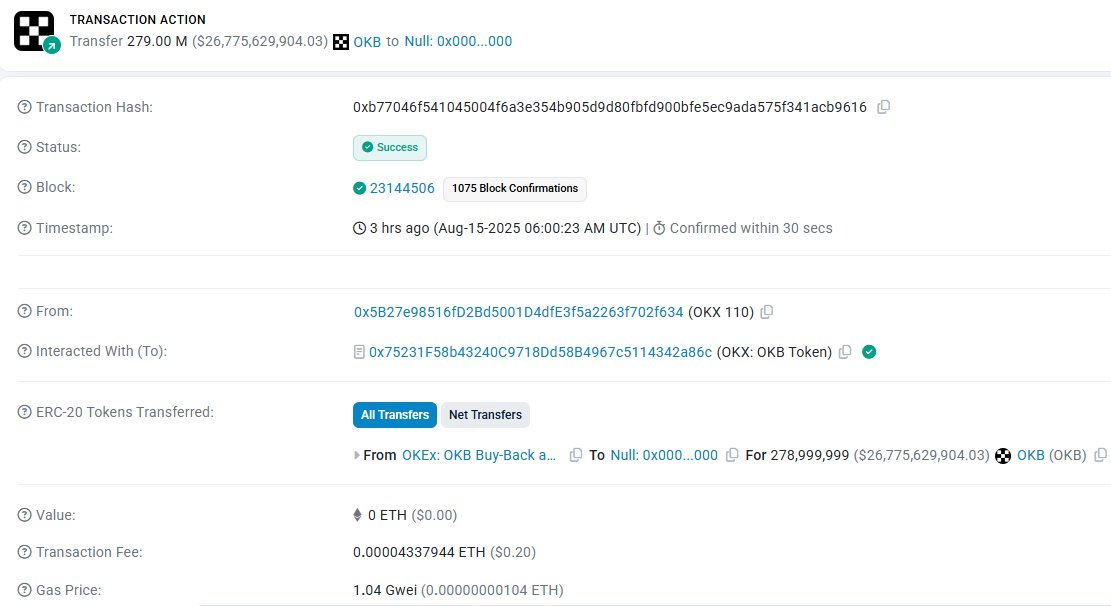 Notably, the burn follows an announcement on Wednesday where OKX disclosed plans to initiate the transaction. The exchange revealed it would carry out a one-time burn of 65 million OKB tokens, dropping its total supply to 21 million.