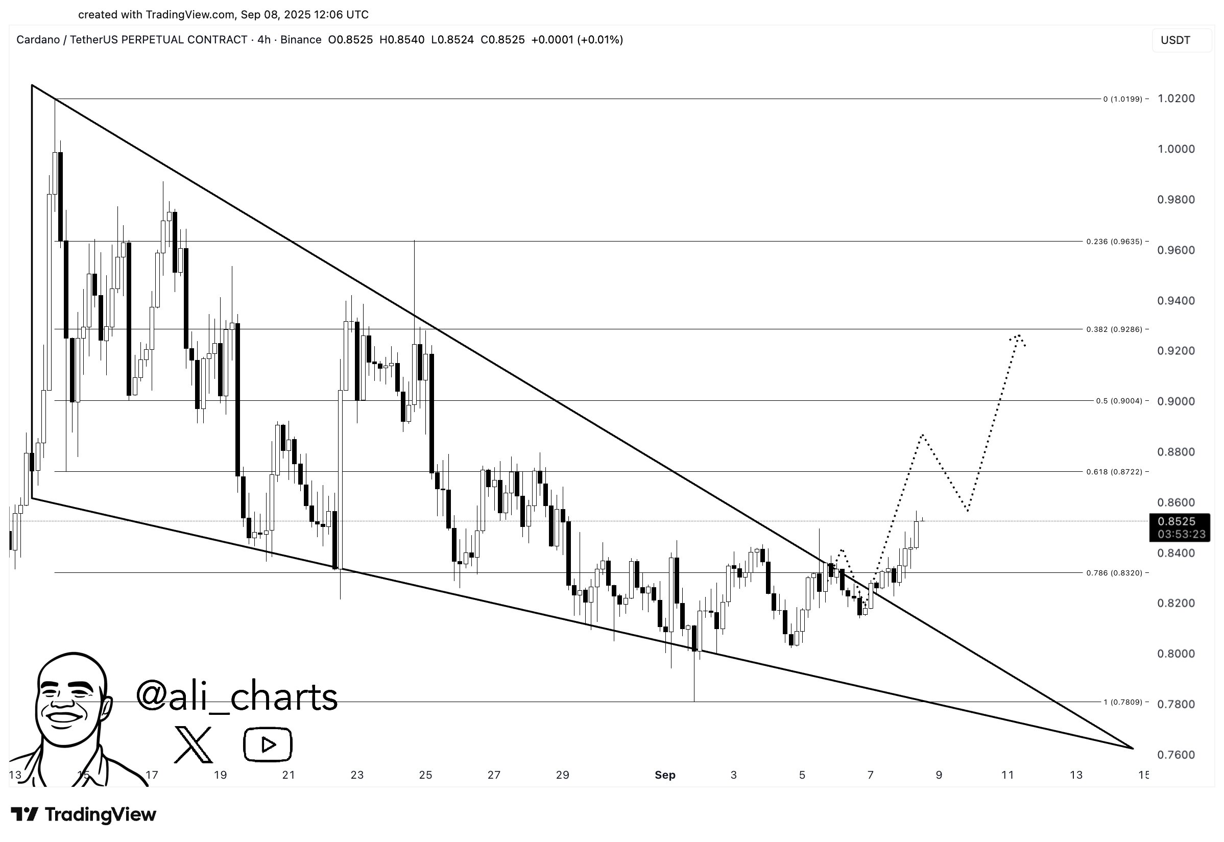 Meanwhile, analyst Ali Martinez also confirmed that Cardano has broken out. He shared in an X post today, predicting that the token’s next target is $0.92.