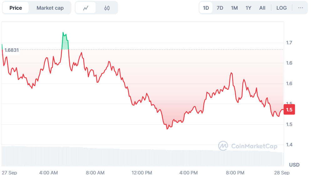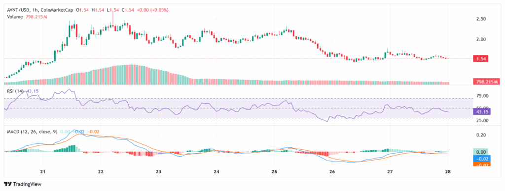 Avantis (AVNT) is currently trading at $1.54 with a 6.96% decline over the past 24 hours. Despite this decline, the coin has exhibited significant volatility in recent weeks. Its trading volume has fallen by 31.23%, and it is standing at $798.215 million. However, AVNT ROSE by 9.17% in the past seven days, which implies that even though the market is rather volatile currently, there is still room to gain.