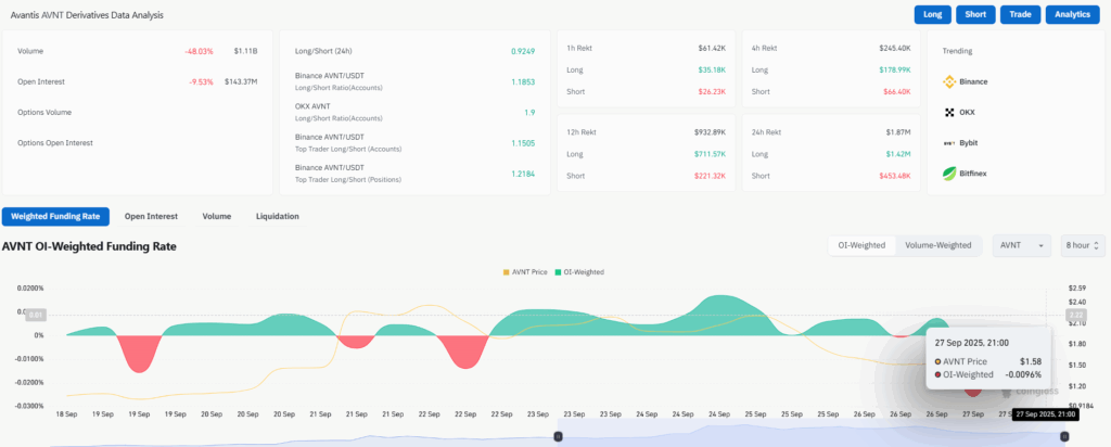 CoinGlass data indicates that the trading volume is down by 48.03% to $1.11 billion. Open Interest has also declined by 9.53%, as it has reached $143.37 million. The Avantis OI-Weighted Funding Rate stands at -0.0096%, which is relatively bearish.