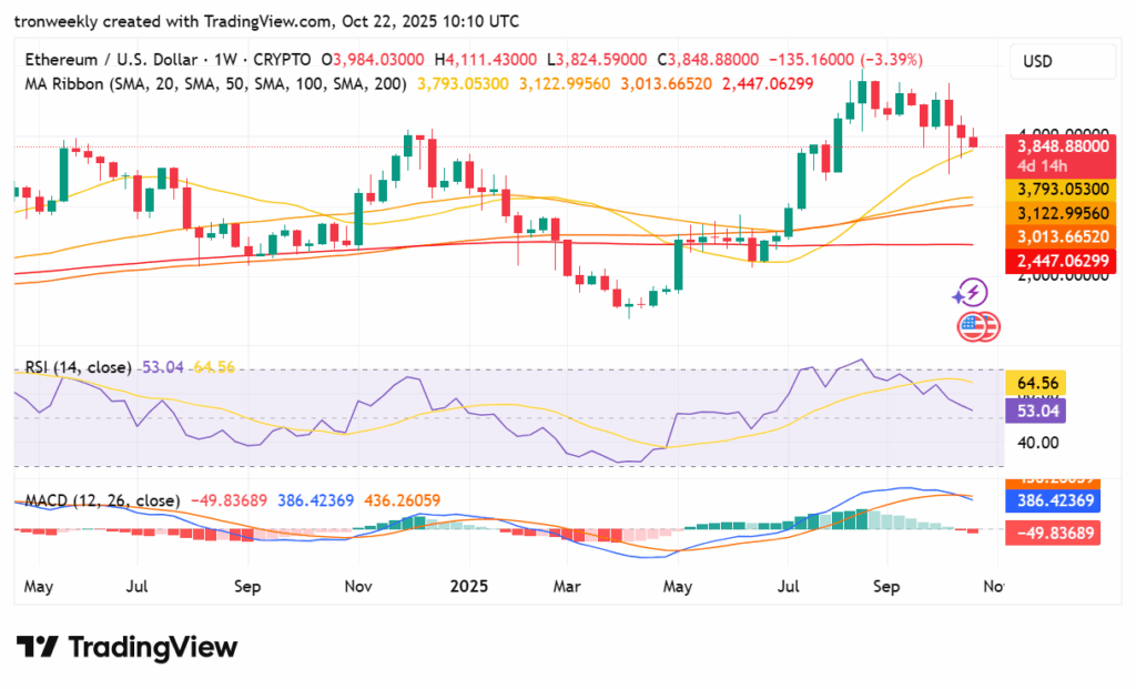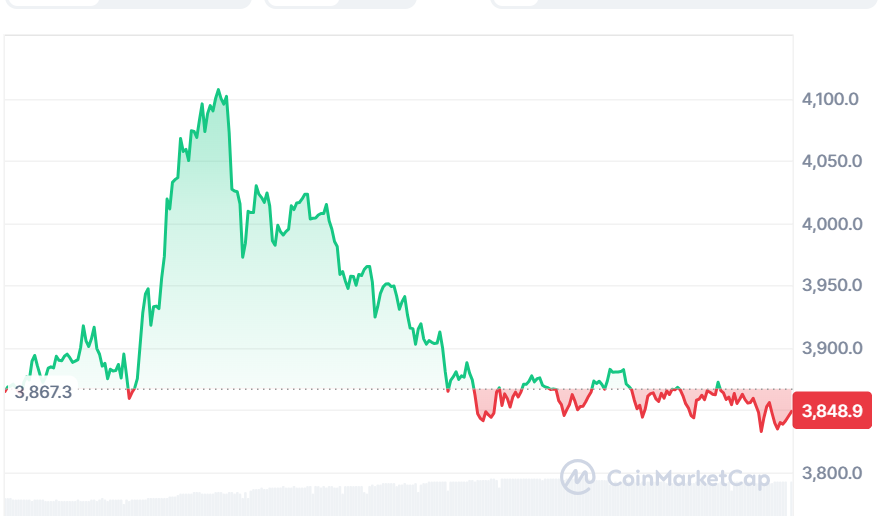 At press time, ETH is trading at $3,848, showing a slight 0.55% decline over the last 24 hours. The ETH holds a market capitalization of $465.38 billion and has seen a 24-hour trading volume of $54.12 billion, reflecting continued high market activity despite short-term pressure.